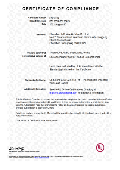 建圳達(dá)THHN美標(biāo)UL尼龍電纜證書(shū)